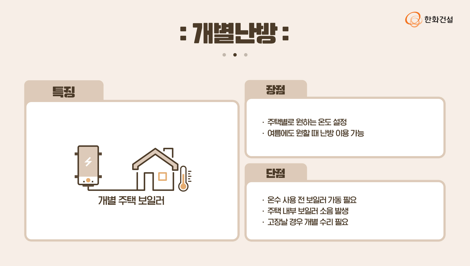 다만 온수를 사용하고 싶을 때 미리 보일러를 가동해두어야 하며, 그렇지 않은 경우 찬물이 나올 수 있습니다. 또 개별 주택 내부에 보일러가 위치하므로 소음이 발생할 수 있고, 고장날 경우에는 각자 수리해야 한다는 특징이 있습니다.